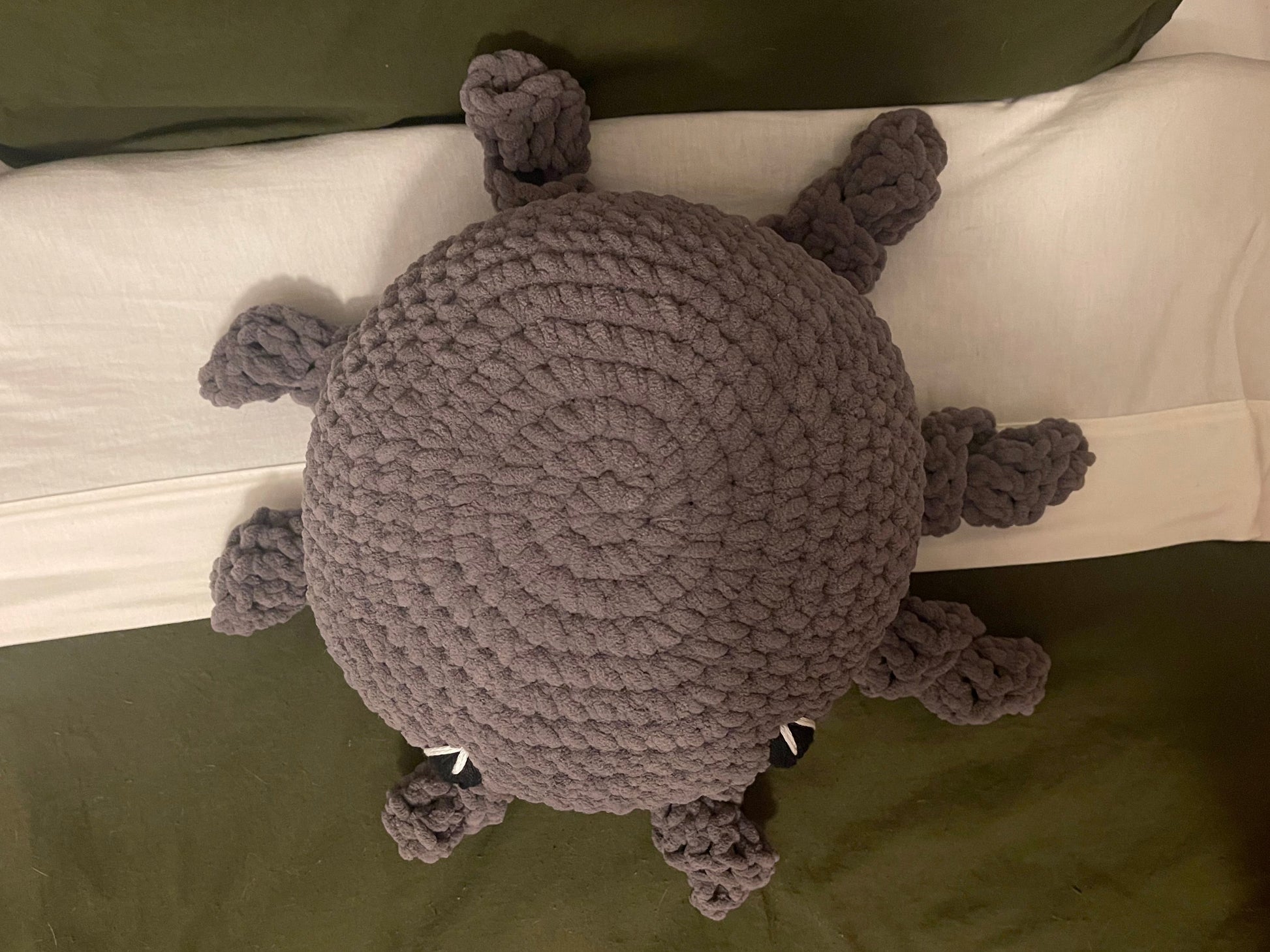 This sweet and adorable jumbo octopus amigurumi crochet plushie makes a great gift and a wonderful addition to any plushie collection. They feature a custom color, black with white embroidered eyes, and a black embroidered mouth.